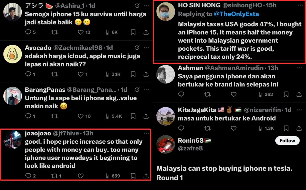 The announcement sparked mixed reactions from netizens, with some agreeing that the increase in tariffs is a good move for the Malaysian government. A Twitter user (@/sinhongHO) commented, “Malaysia taxes USA goods 47%, I bought an iPhone 15, it means half the money goes into the Malaysian government’s pockets. This tariff war is good, reciprocal tax is only 24%”. However, it’s worth noting that the government have refuted Trump’s claim that Malaysia has set a 47% tariff on the US.