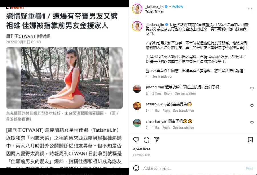 According to the self-alleged friend, Tatiana and her ex dated for over three years. In fact, Tatiana supposedly came to Taiwan because of him. She even took his surname Lin as they were still dating at the time. The source stated that the duo had lived together in a well-known luxury pad in Taipei. They added that Tatiana’s ex had also given her pocket money each month and funded repairs for her place in Ukraine.