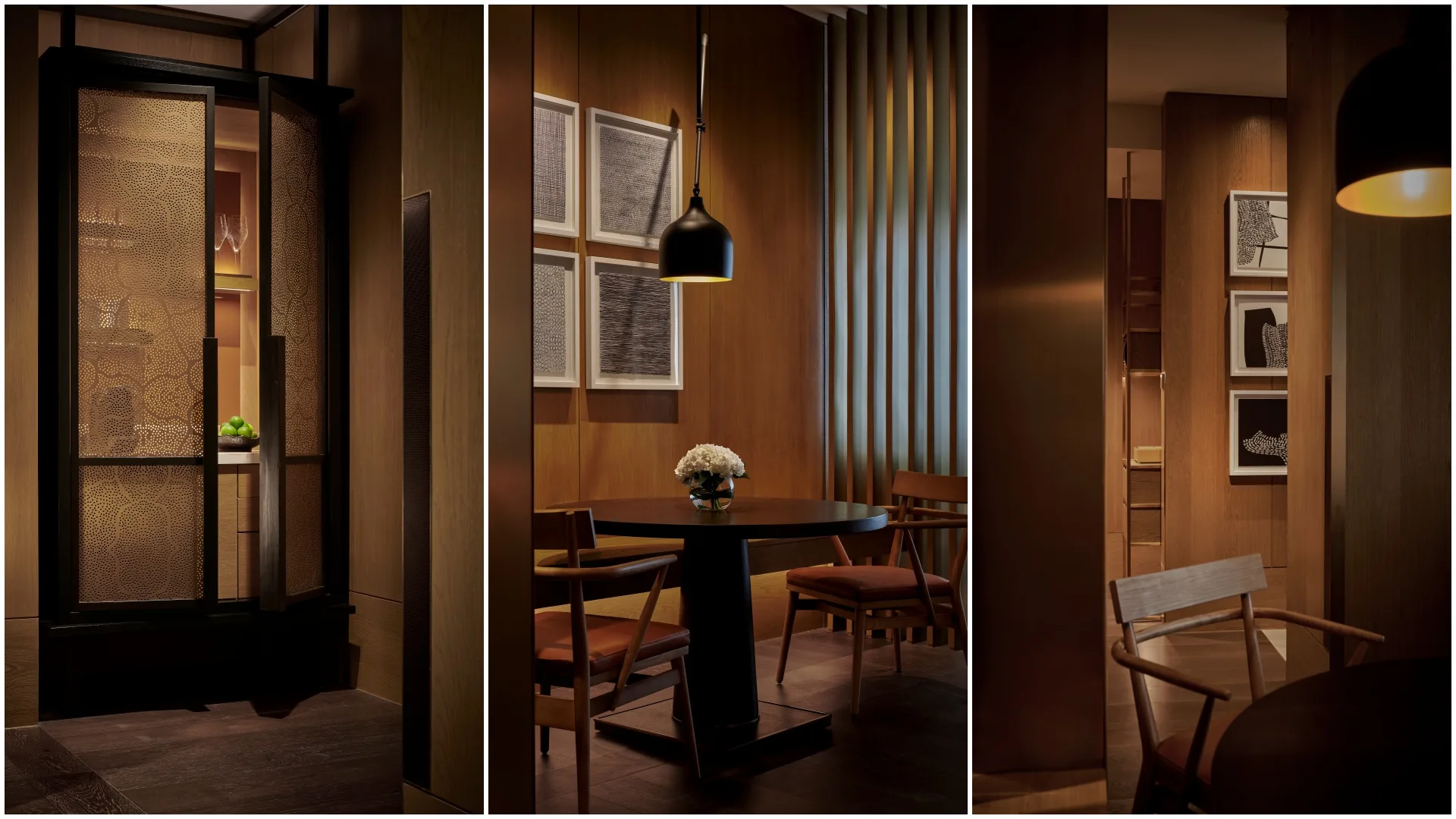 Interiors by G.A Group are inspired by the vernacular beauty of the traditional Malay Kampung house. Sculptural centrepieces set a striking first impression, while meticulous artisanal detailing throughout creates sophistication above the city. Perforated brass screens, etched with batik canting patterns, balance openness with intimacy. The natural timber accents and woven textures are inspired by traditional basket weaving and Peranakan textures, introducing an organic warmth.
