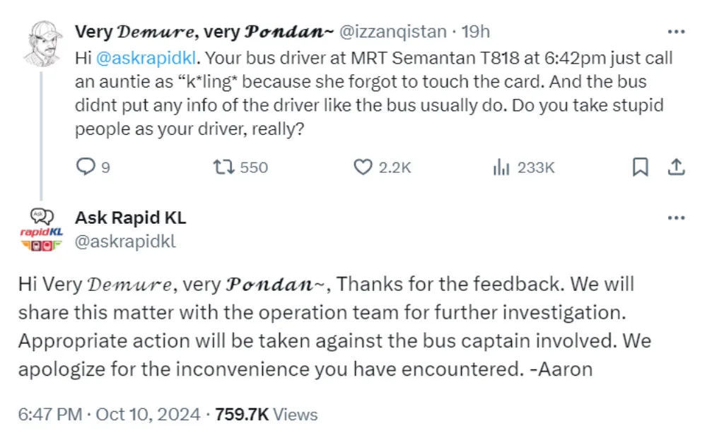 Recently, Twitter user @/izzanqistan reached out to the Rapid KL social media account to complain about a rude bus driver they encountered during their commute. According to the user, the bus driver had called an Indian woman a derogatory slur during the bus ride and failed to provide their staff information on the vehicle for riders’ identification. Rapid KL then replied to the tweet to apologise for the issue and take action against the bus driver.