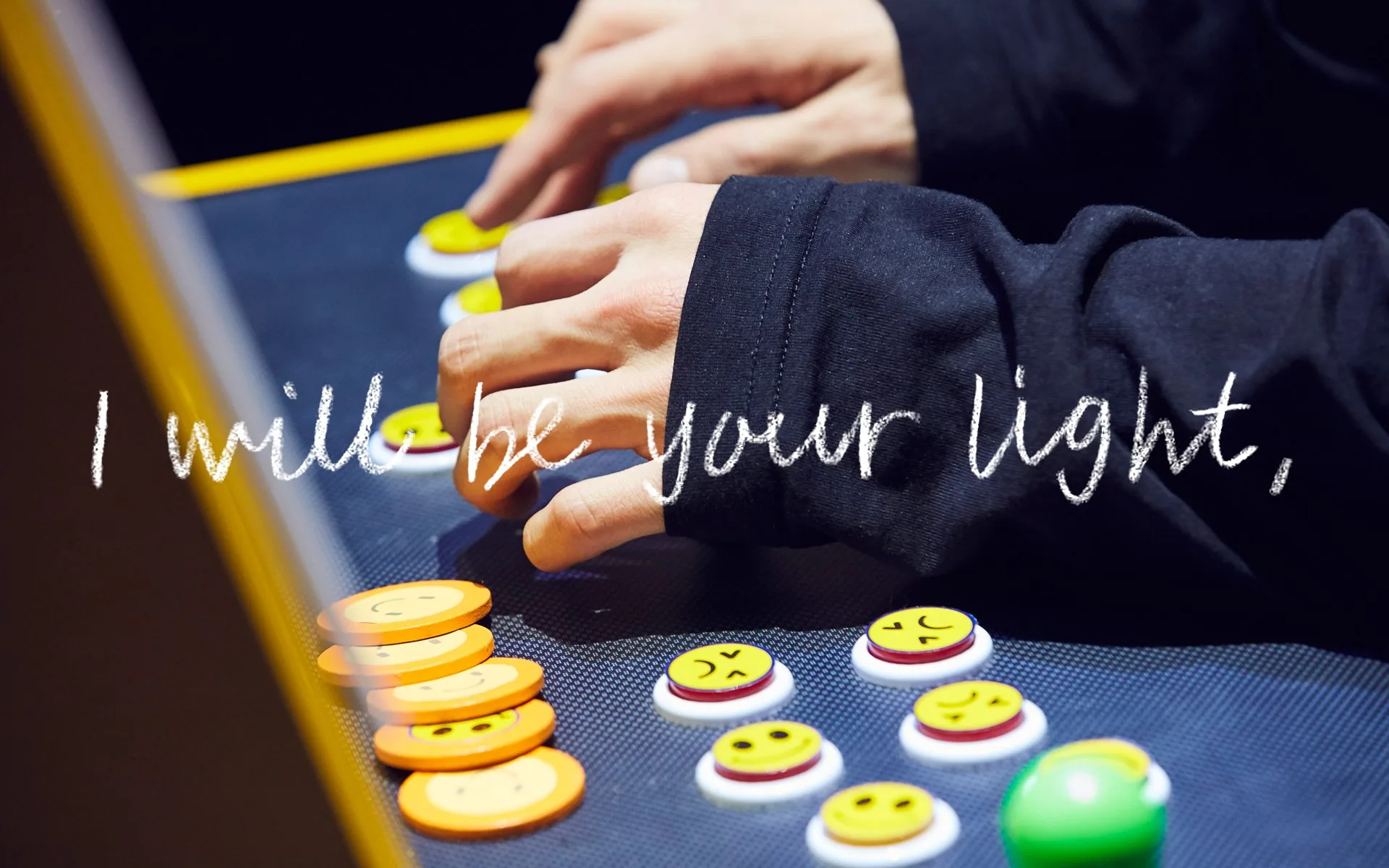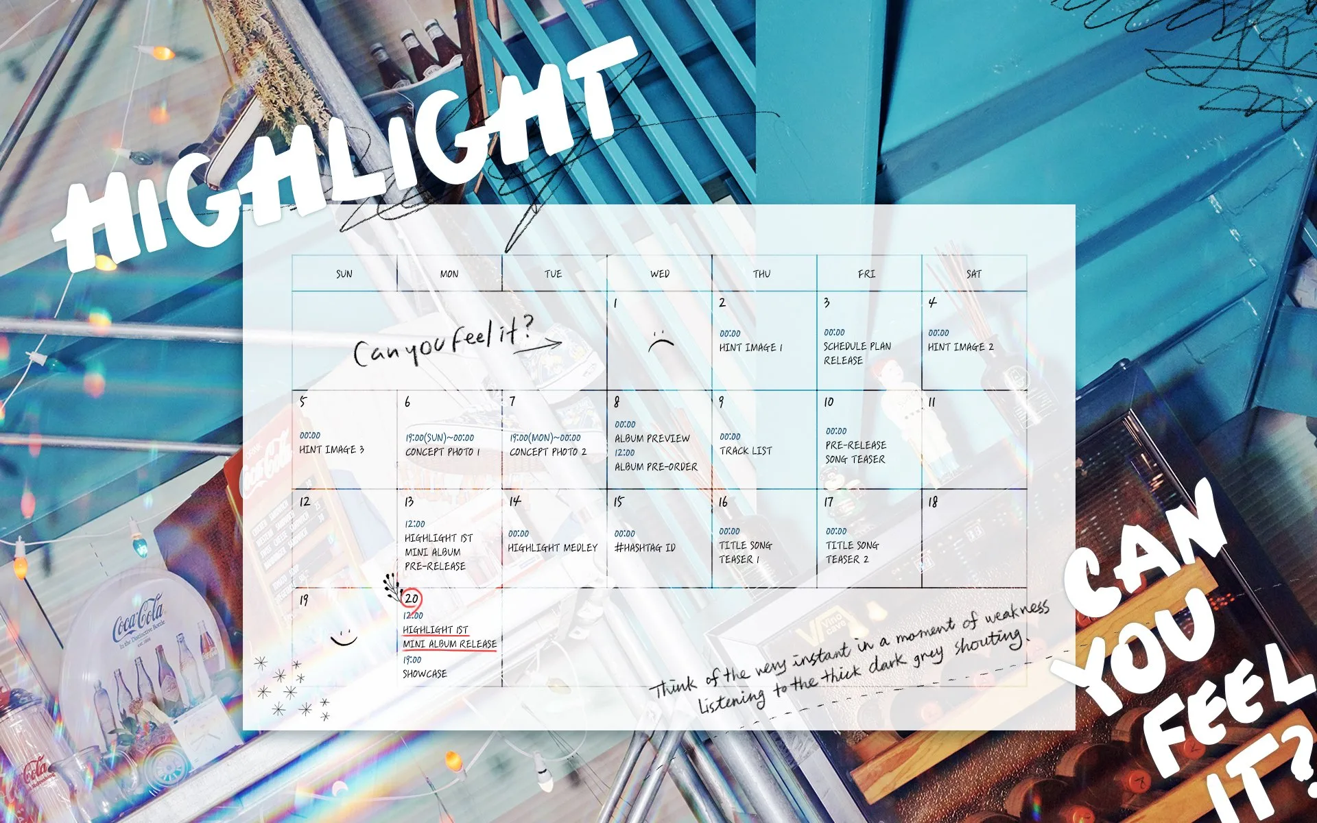 The image gives off a slightly retro vibe, with the words “Highlight” and “Can You Feel It?” painted in a comical font. Although the image is in bright colours, a sentimental sentence can be seen on the bottom right. It says, “Think of the very instant in a moment of weakness, listening to the thick dark grey shouting.”