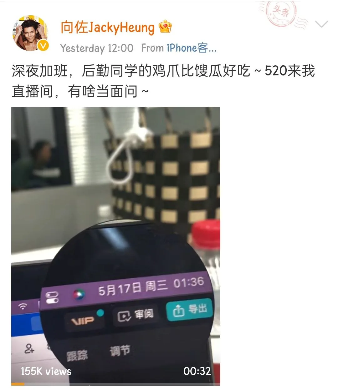 “Working till late at night, my fellow logistic crew’s chicken feet is way delicious than rotten melon (useless gossip)~Come to my live broadcast during 520 (20th May), ask me anything you want face to face then~”