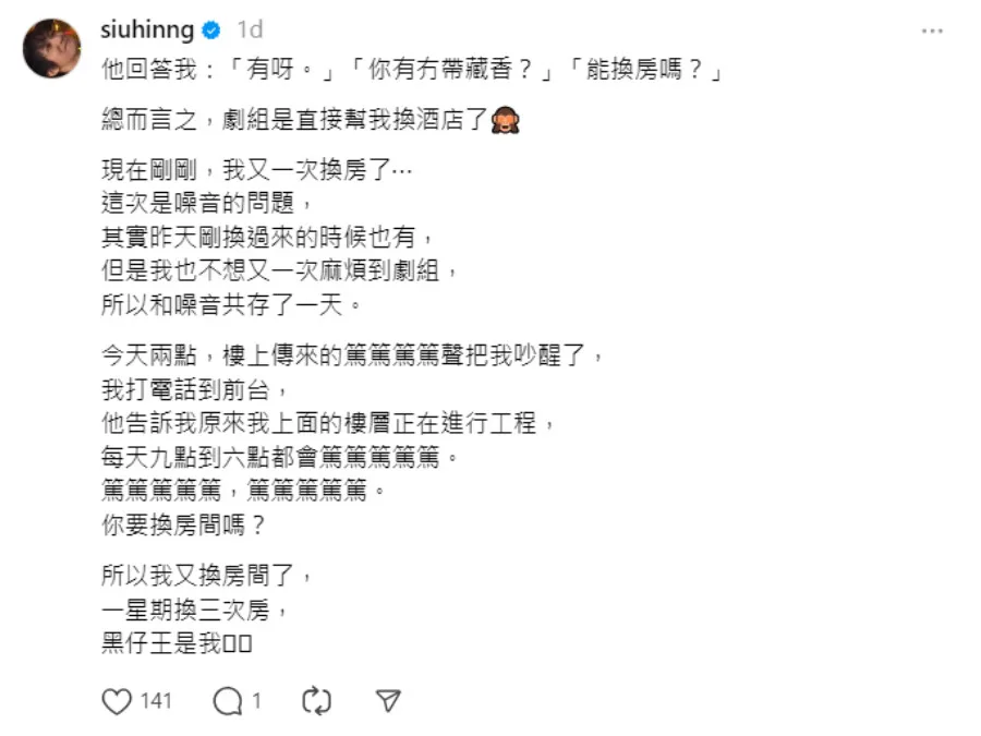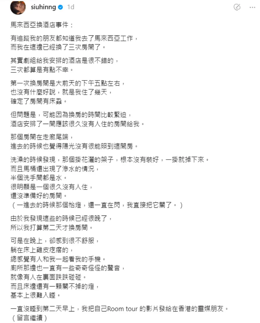 The star, currently in Kuala Lumpur to film an upcoming movie, recently shared about his “bad luck” with hotels on Threads. According to Siu Hin, he had to change hotel rooms three times since coming to Malaysia last week. He shared that the hotel was great overall and that his first room was good – but only for a few days. Unfortunately, he realised there were bed bugs, so he had to switch to the new room.