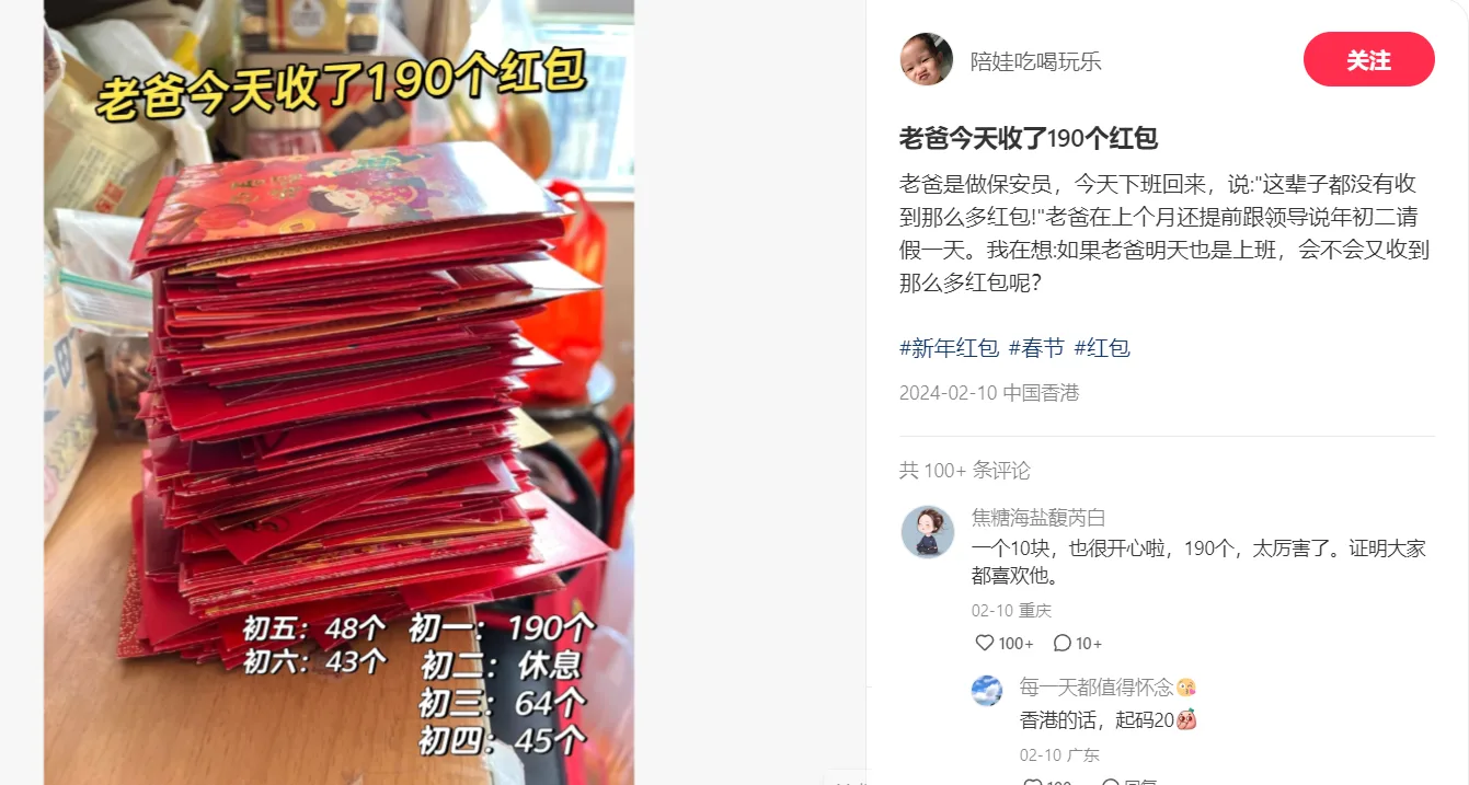 On 10th February, a netizen made a post on Xiao Hong Shu (小红书) claiming her dad had been very blessed this Chinese New Year. Apparently, he had changed his job last year and became an apartment security guard. During the festive season, he worked in shifts at the apartment. However, he had not expected to receive ang paos from the apartment residents, and not in large quantities.