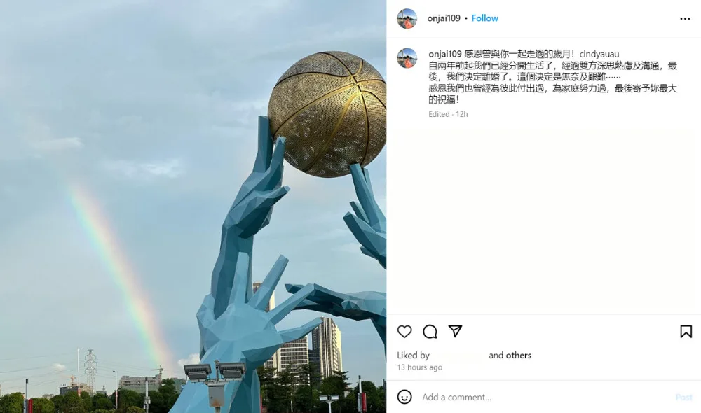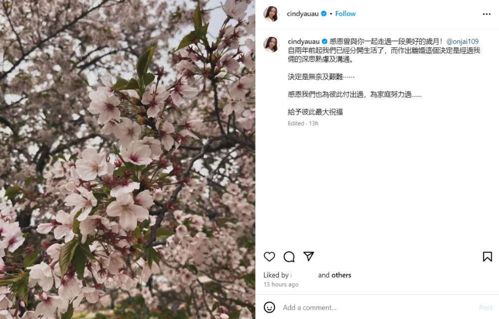 The pair shared the news yesterday (2nd May 2024, Thursday) through their Instagram accounts. In the post, both stars wrote a joint message, thanking each other for their time together. Roger and Cindy also revealed that they’ve separated for the past two years, adding that the decision to divorce was made after careful consideration and communication.