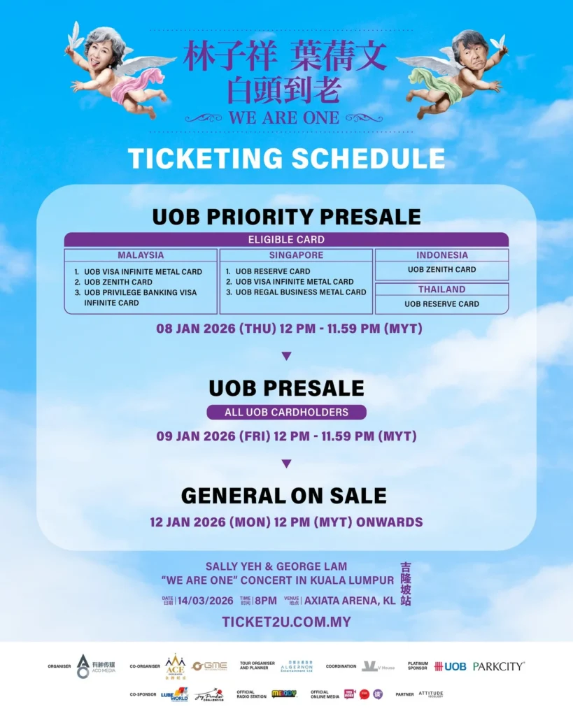George and Sally are bringing their “We Are One” world tour to Malaysia, performing at Axiata Arena on 14th March 2026 (Saturday), 8pm. The concert is organised by ACO Media, with support from ACE Integrated and GME International. Tickets will go on sale on 12th January 2026 (Monday), with a presale for UOB cardholders on 8th and 9th January 2026 (Thursday and Friday).