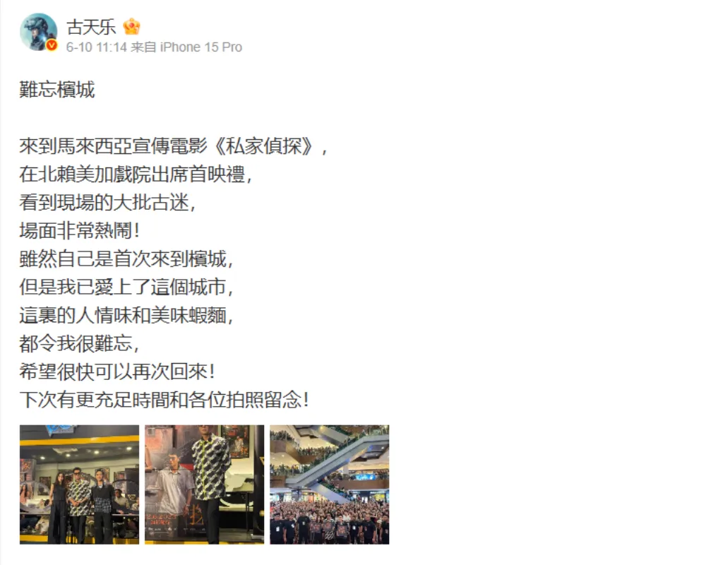 Louis wrote, “Although this was my first time in Penang, I’ve fallen in love with this city”. The actor specifically mentions the local delicacy, prawn noodles, saying, “The human touch and the delicious prawn noodles here are unforgettable.” He ends his post by promising to return soon, adding that he’ll remember to take more photos with fans the next time he’s in town. The Weibo post garnered the attention of local fans.