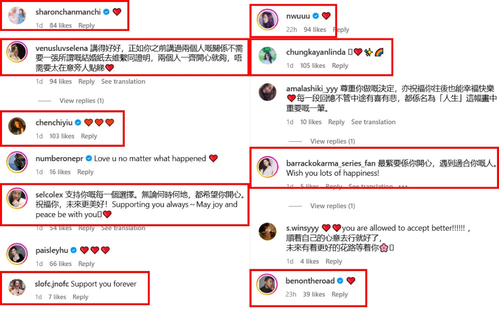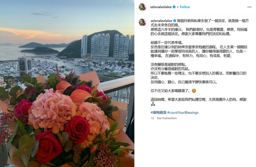 Towards the end of her post, the actress asked for privacy for her and her partner, who is a non-celebrity. Friends and fans alike have since expressed support for Selena following her announcement. Stars like Sharon Chan (陳敏之), Nancy Wu (胡定欣) and Yoyo Chen (陳自瑤) have commented on the post, showing love for the recently single 43-year-old. On the other hand, fans say they’ll support the public figure in all her decisions.