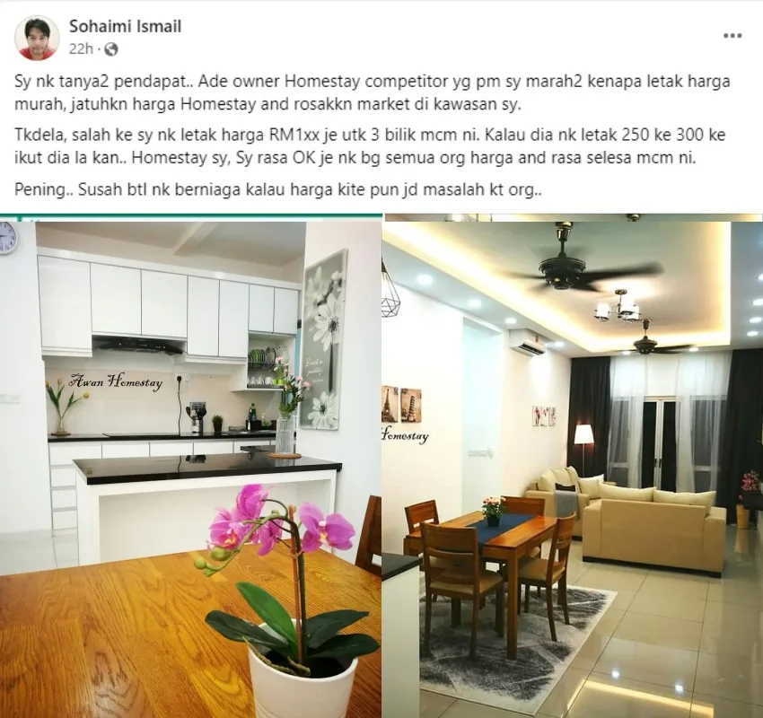 However, this homestay owner shared that a competitor was not very happy that he set a low price for his homestay, accusing him of dropping its value. Here’s the story: