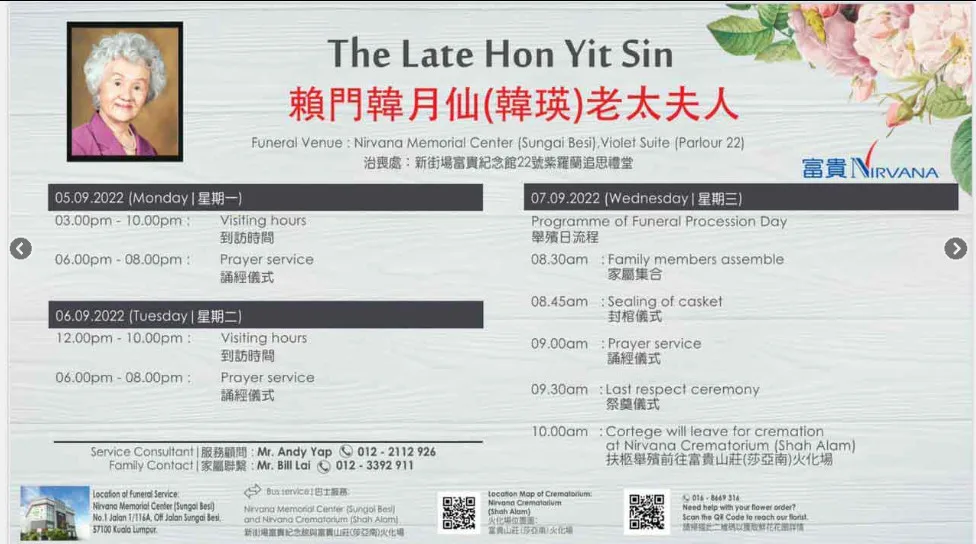 Yit Sin’s wake will be held today at the Sungai Besi Nirvana Memorial Center. Her funeral will be held two days from now on 7th September at 10am. Our hearts go out to her family and friends. May they find peace in her passing.