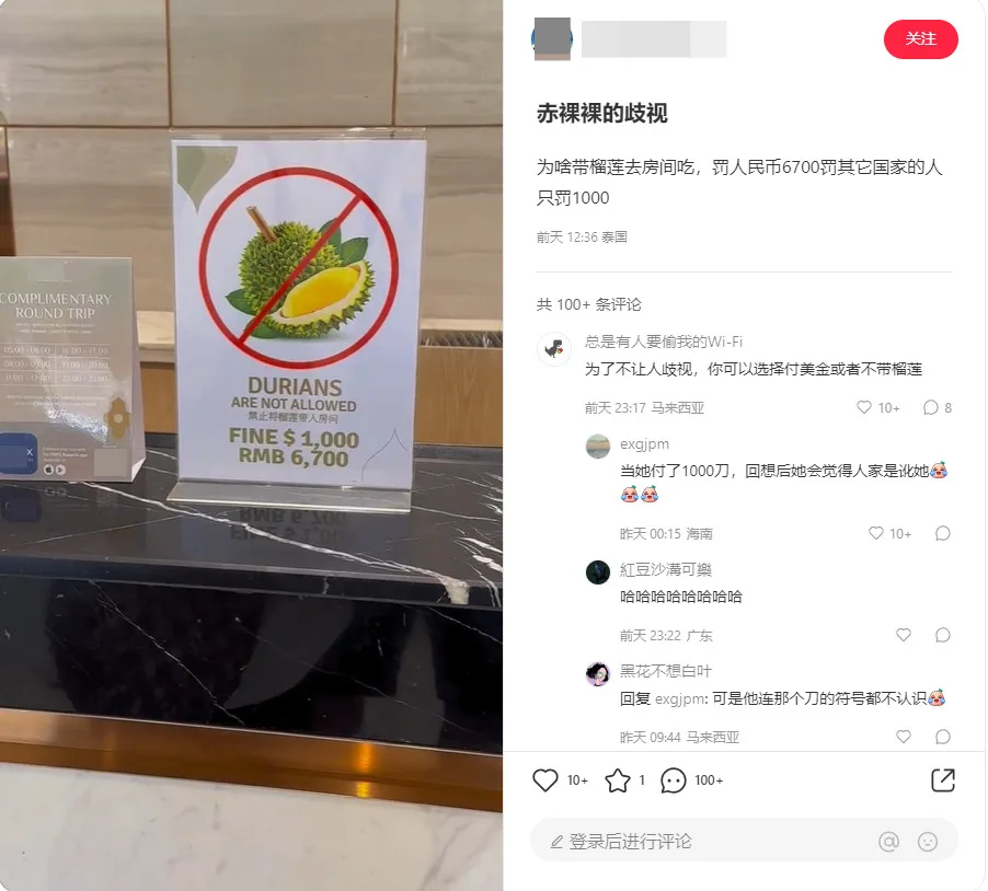 The video, titled “Blatant Discrimination” was uploaded to 小红书 on 25th June. The short clip showed a fairly common sign at the hotel’s reception counter declaring that durians were not allowed. If caught, they would be fined $1000 or RMB 6,700.