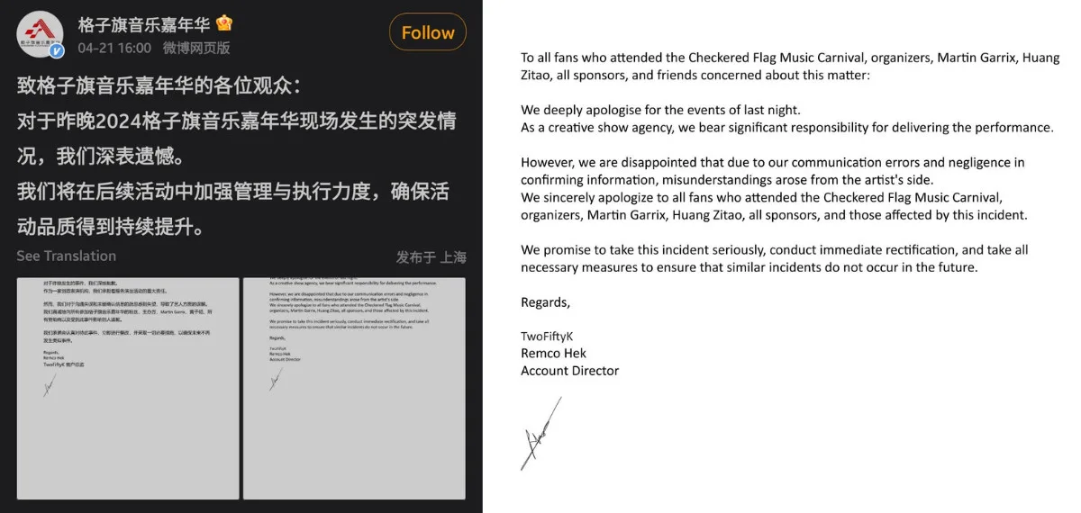 The Dutch DJ had recently performed at the 2024 Checkered Flag Music Carnival in China. He was also supposed to perform a collaboration with Chinese singer Huang Zitao (黄子韬). Unfortunately, during the day of the show, Martin performed the song on stage without Zitao. However, Zitao’s reaction during a backstage livestream led many to believe Martin was at fault for the failed performance.