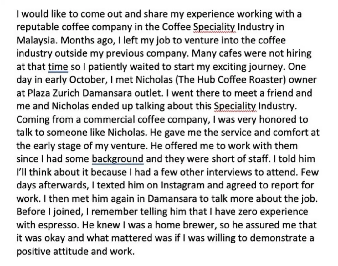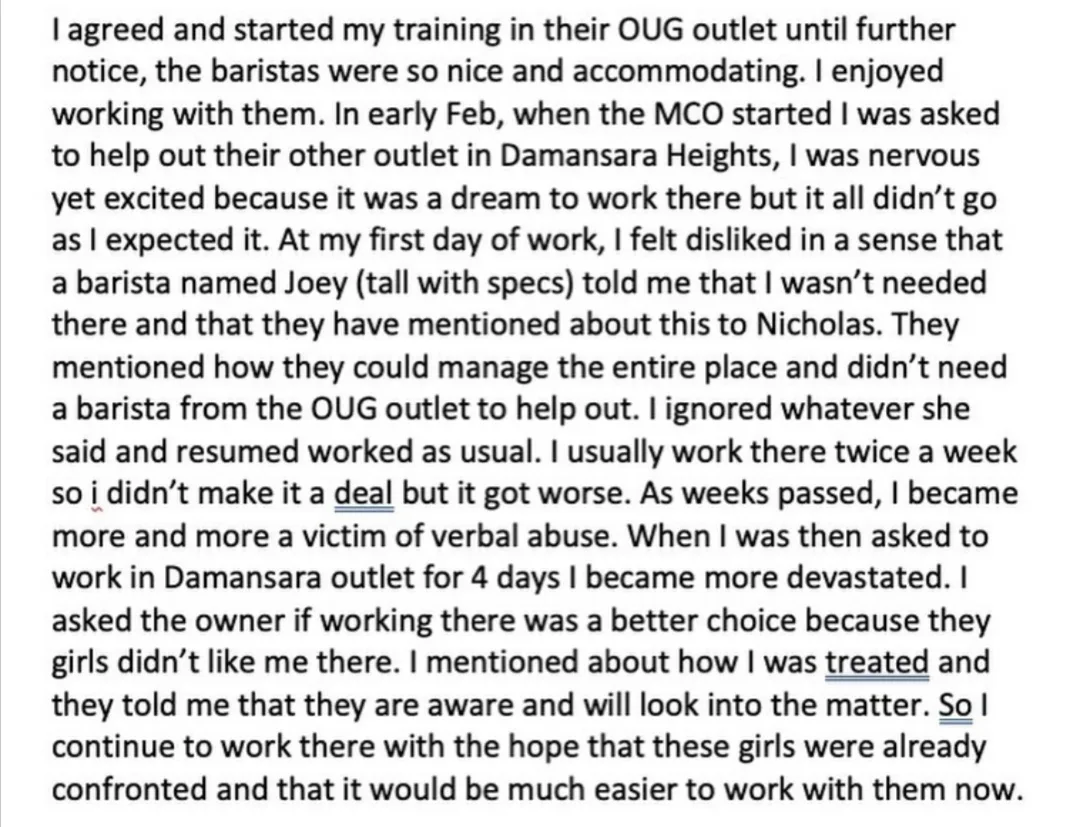 Furthermore, Joey also told Melissa that they could manage the entire outlet without her assistance. She gave no attention to these comments and continued working. Melissa stated that she only worked twice a week at the Damansara outlet, but the situation got worse. The ex-barista stated, “As weeks passed, I became more and more of a victim of verbal abuse”. She became completely devastated when she was asked to work 4 days a week at the outlet.