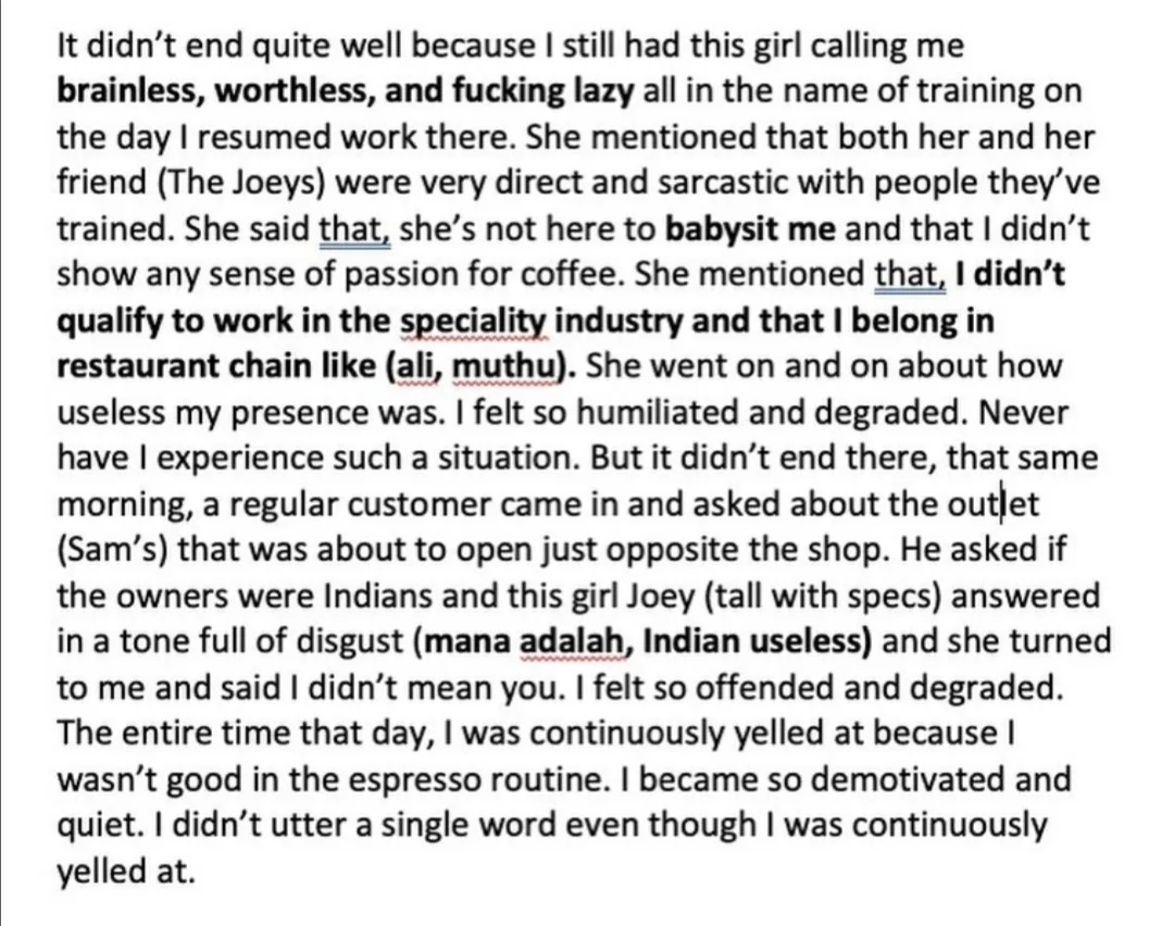 Melissa reached her breaking point when a regular customer asked if the opposite outlet were owned by Indians. Joey answered, “mana adalah, Indians useless”. The rude barista then turned to Melissa and said she didn’t mean her. The latter stated how she felt so offended and degraded. In addition, Melissa would be continuously yelled at throughout the whole day. She then became demotivated, silent, and unable to say a single word.