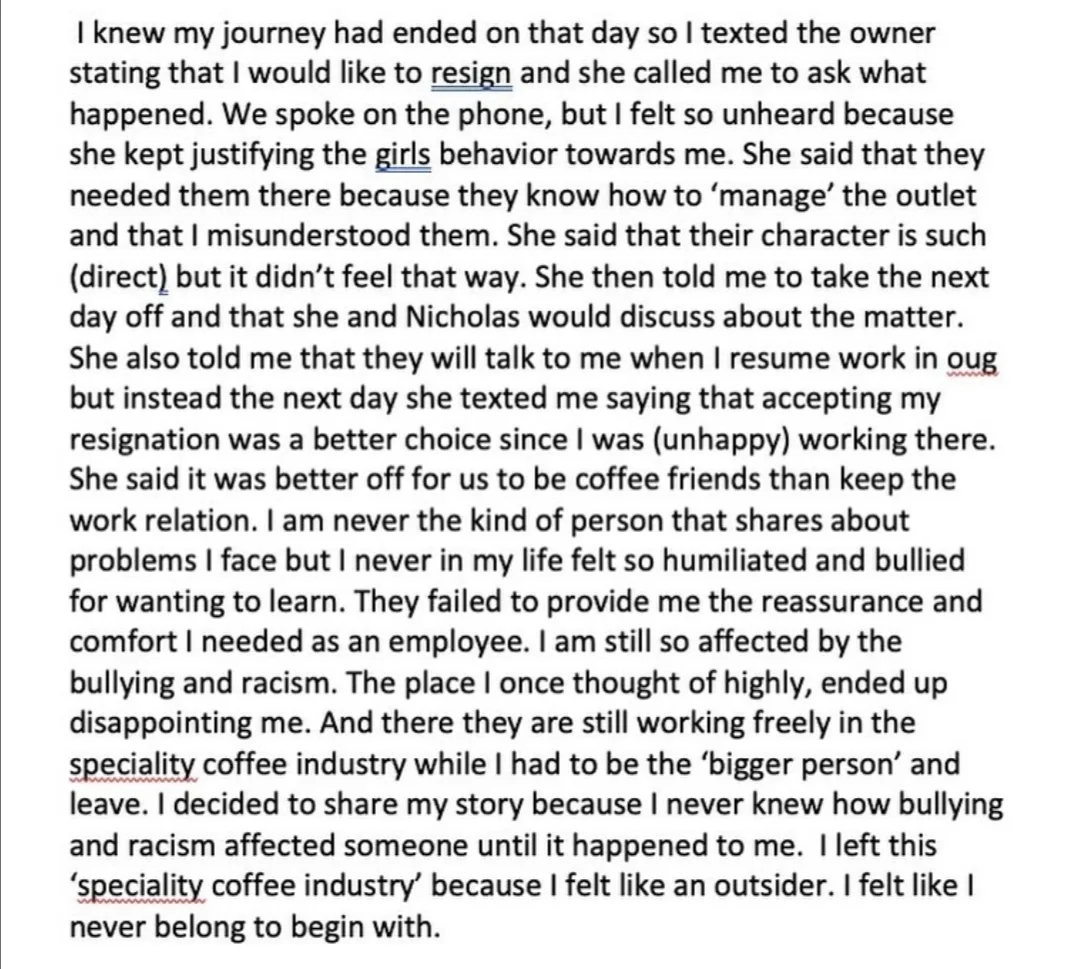 Melissa wrote how “it’s been a week” and that her trauma still lingers in her mind until now. She “never understood how verbal abuse and racism” can affect people until it happened to her. The ex-barista mentioned how she is often the one who understands and has to put up with how other people treat her. But she feels unheard as she is a human being with emotions as well. The home-brewer expressed, “I’m sorry that the colour of my skin or my previous work experiences were not good enough to qualify to work for the industry”.