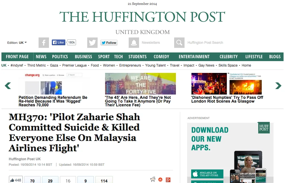 Recently, Huffington Post UK posted an article claiming MH370 pilot Capt Zaharie Ahmad Shah caused the disappearance of Malaysia Airlines Flight MH370 when he committed suicide.
