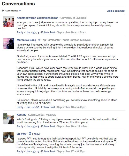 Janis Powers‘ article, which briefly skimmed past the MH370 and MH17 tragedies, as well as her belief that “the Petronas Towers are part of a well-executed scheme to convince the world that the country of Malaysia, as embodied by its capital, KL, is as modern and advanced as the towers themselves” was also met by angry netizens – again, both Malaysians and non Malaysians.