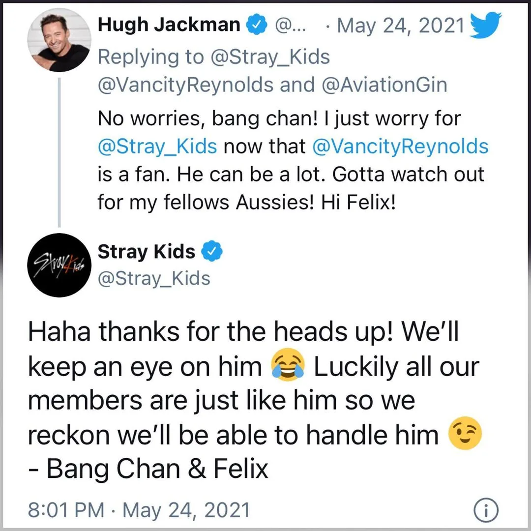 Hugh Jackman is now following @Stray_Kids’ Instagram account! pic.twitter.com/QBBLTq9GNo