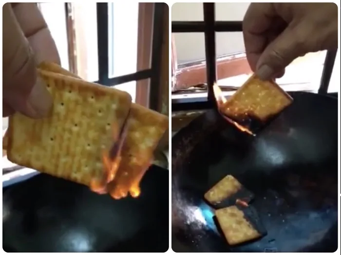 The man, whose face was not shown throughout the entire video but can be heard speaking in a Chinese dialect, lit up a couple of Hup Seng’s “Ping Pong Special Cream Crackers” with a cigarette lighter and watched as the crackers burned. As the crackers charred and appeared to be melting, he then claimed that they could contain or is laced with synthetic material.