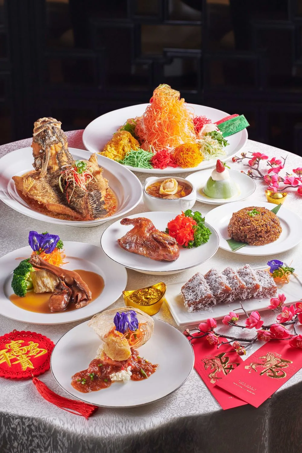 Indulge in a feast of flavours with our set menus, each showcasing a unique culinary experience. Shang Palace offers five distinct set menus, including a vegetarian option, adding a touch of indulgence to the auspicious Lunar New Year celebrations. Set menu prices range from RM158 nett per person for the Five Blessings 5-course Set Lunch (minimum 4 persons) to RM398 nett for the Happy Reunion 9-course Set Menu (minimum 6 persons). All set menus commence with vibrant Yee Sang and conclude with a delectable combination of Pan-fried Nian Gao, ensuring a delightful beginning and sweet ending to your dining experience.