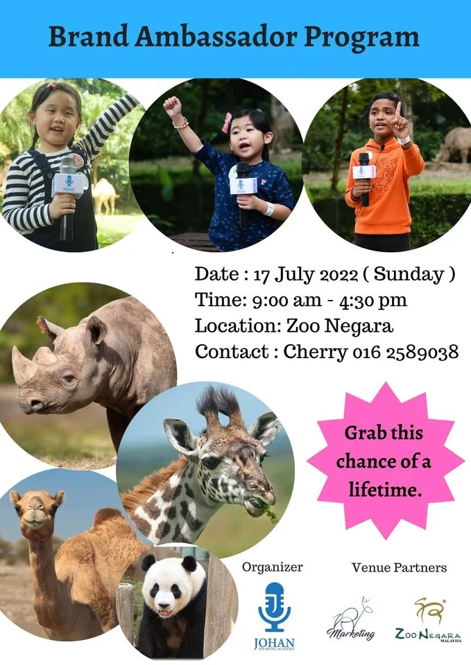 Show your support for the brand ambassadors for Zoo Negara, Johan Speaking Academy’s students. The Kids Ambassador Program teaches children of ages 5 to 11 years old to improve their communication skills, share key messages and leadership qualities. Join the event and watch as the young face the real world confidently.