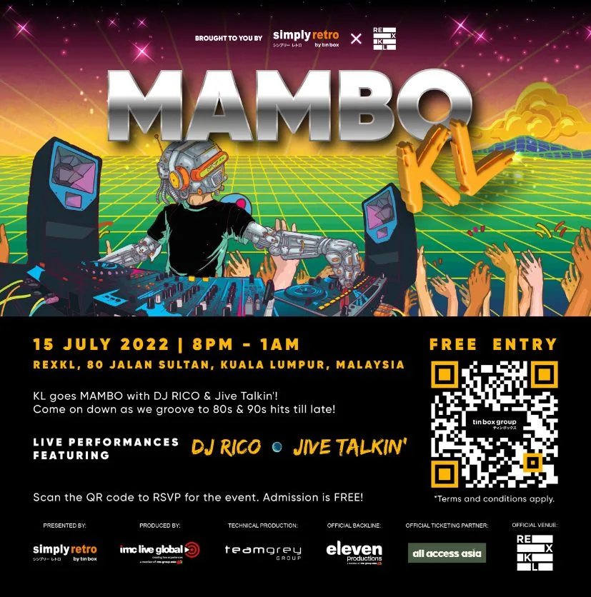 Sway to the music with Mambo KL—a one-night only retro music showcase at REXKL. In collaboration with Singapore-based lifestyle Tin Box Group, Mambo KL features live gigs from Singapore’s most popular veteran brands Jive Talkin’ and radio celebrity DJ Rico. Dance the night away as they play retro tunes from the 70s to 90s.