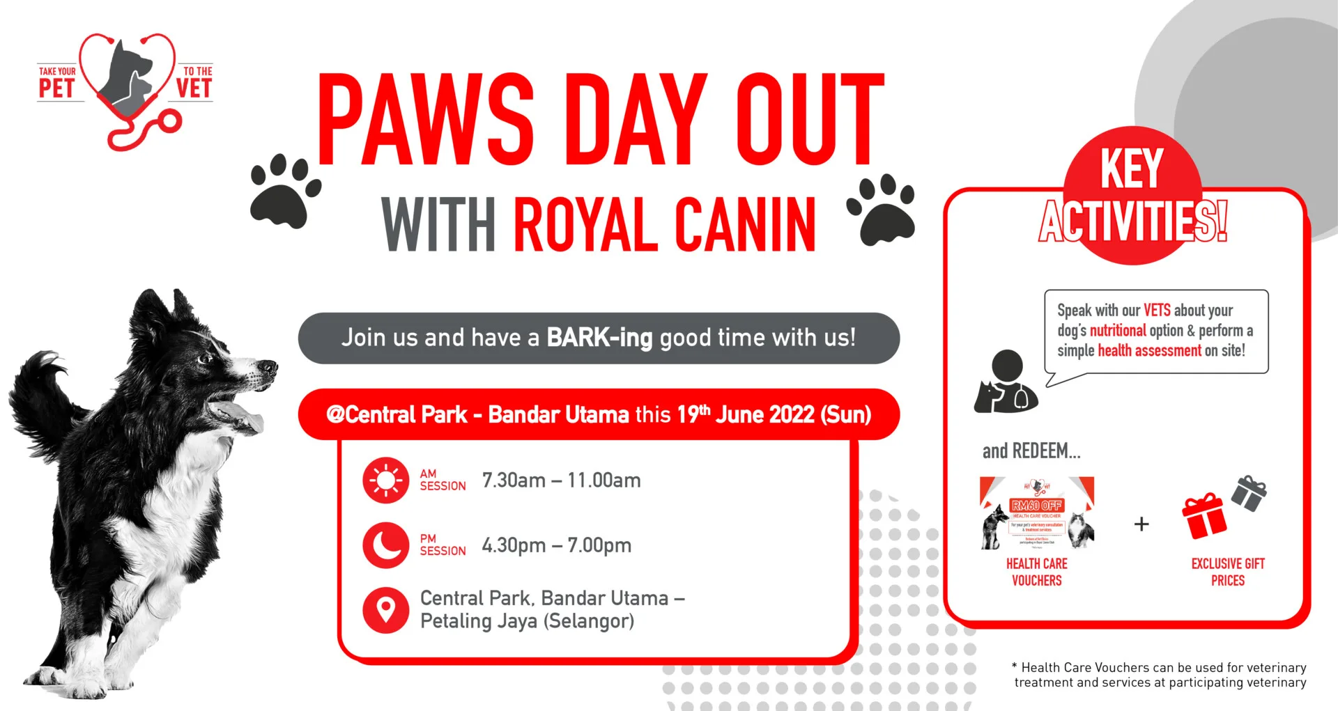 Dog lovers assemble! With the goal to create more opportunities for Malaysian dog owners to kickstart the healthy habit of bringing their pets for regular vet visits, Royal Canin’s Take Your Pet to The Vet campaign will be dedicating a day just for you and your dog. Royal Canin’s Paws Day Out 2022 raises awareness on the importance of consistently taking your pet to the vet to help your dogs live healthier and happier lives. Join them to have a BARK-ing good time!