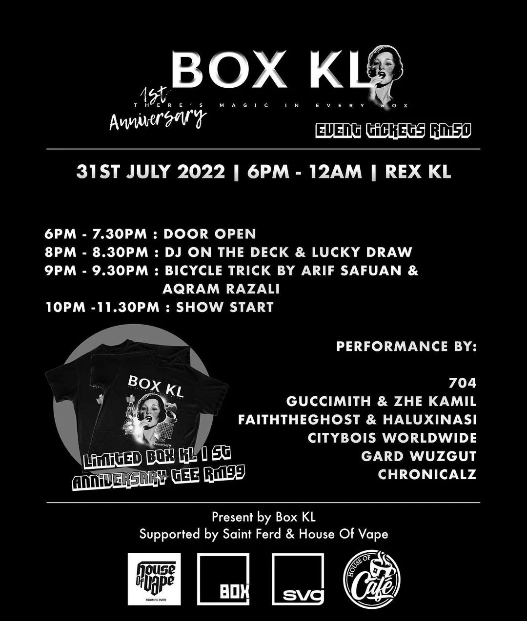 Coffee shop BOX KL is organising its first event to celebrate its 1st anniversary. With epic performance line-ups such as GUCCIMITH & Zhe Kamil, ChronicalZ, Citybois Worldwide, and more, Arif Safuan and Aqram Razali will perform bicycle tricks, and there will be a lucky draw as well! Go here for more information about the event and here to buy the tickets.