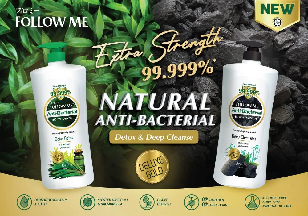 FOLLOW ME has just introduced their Anti-Bacterial Body Wash Deluxe Gold Range with enhanced Natural Anti-Bacterial Protection—FOLLOW ME Anti-Bacterial Deep Cleansing Charcoal and FOLLOW ME Anti-Bacterial Daily Detox Tea Tree.