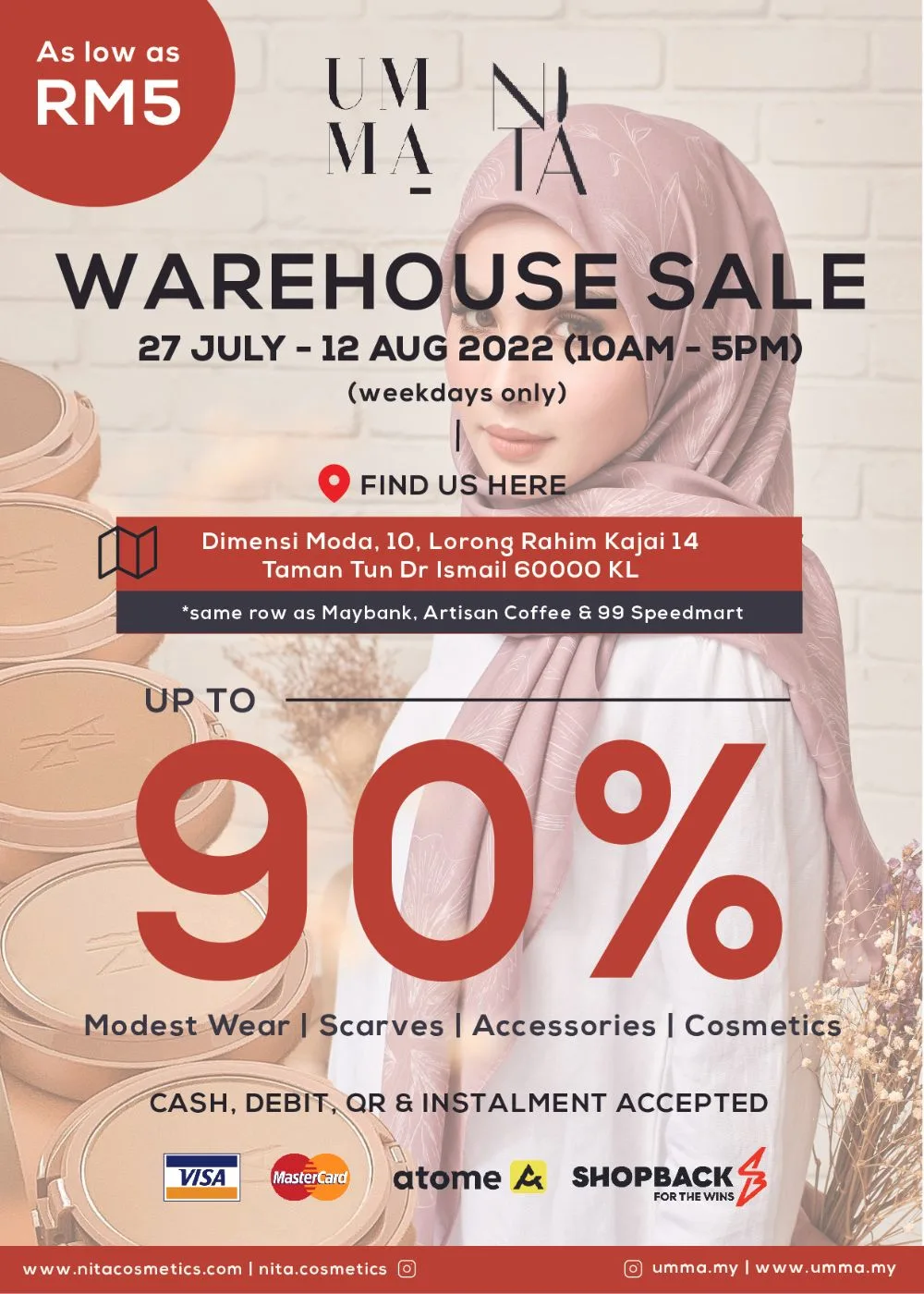 Who doesn’t love a sale? Especially one that has up to 90% discount of items such as modest wear, scarves, accessories and cosmetics. NITA Cosmetics is holding a warehouse sale with prices as low as RM5. Seems like a pretty good deal to us. You could also check out their famous 2-in-1 Pemadam Foundation & Concealer, 3-in-1 Brow Jam and also get a NITA Tote Bag to go.