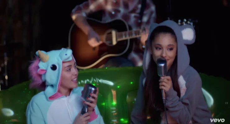 For her latest Happy Hippie Backyard Session, Miley Cyrus teamed up with Ariana Grande to perform a spot-on cover of the 80s hit “Don’t Dream It’s Over”. Dressed in onesies – Cyrus as unicorn and Grande as “mouse-bear” – the duo sang the classic Crowded House number while sitting on an inflatable couch in Cyrus’ backyard.
