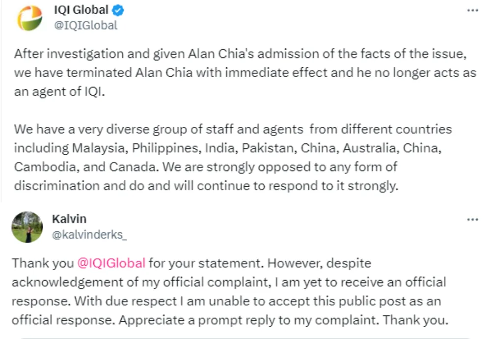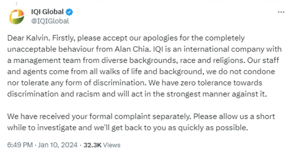 Not long after the issue went viral, former IQI Global agent Alan Chia posted a public apology on Twitter the same day he was terminated from the company.