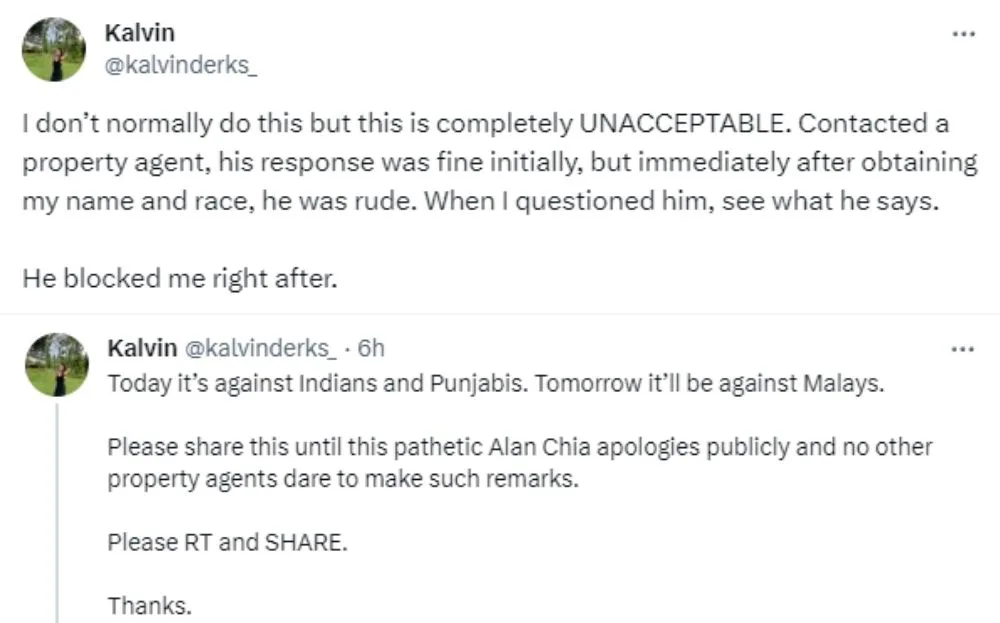 Kalvin was understandably offended by the racist remark but also revealed that Alan had blocked her right after the conversation, which was disrespectful of an agency-backed property agent. In a separate tweet, Kalvin laments that Alan’s racism may not be limited to a specific race and demands the agent to publicly apologise for his remarks. She also said that she hoped the issue could serve as a lesson for other property agents to refrain from making such remarks to clients.