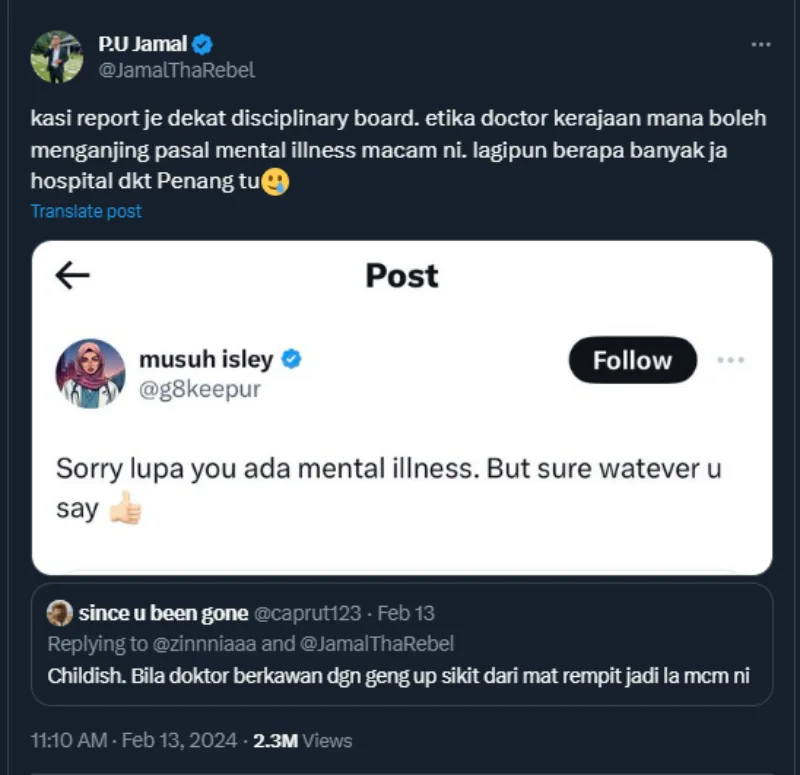 The Twitter user then urged everyone to do the same by providing them with the links to file the complaint against the UiTM graduate. The doctor herself, who is known as Farah, DM-ed Jamal about the post after it went viral. As seen in the screenshots below, it seems that she was unremorseful about her words as she told him, “Why are you even reporting me? Is it the ‘I forgot you have mental illness’ post? That’s a fact though”.