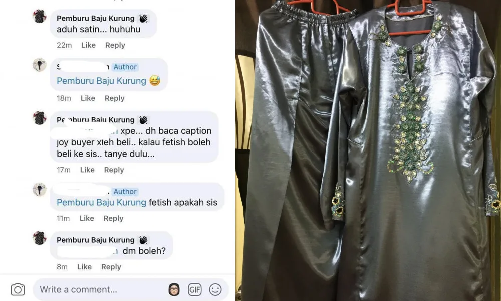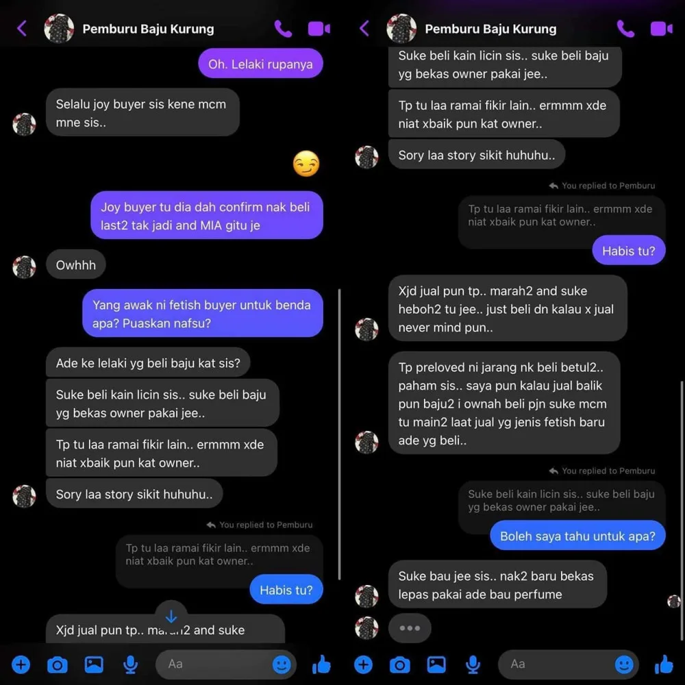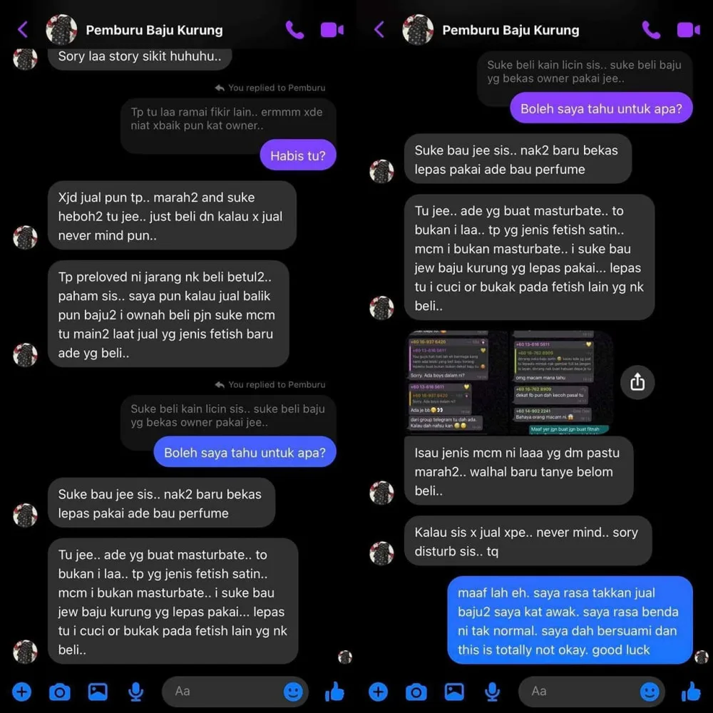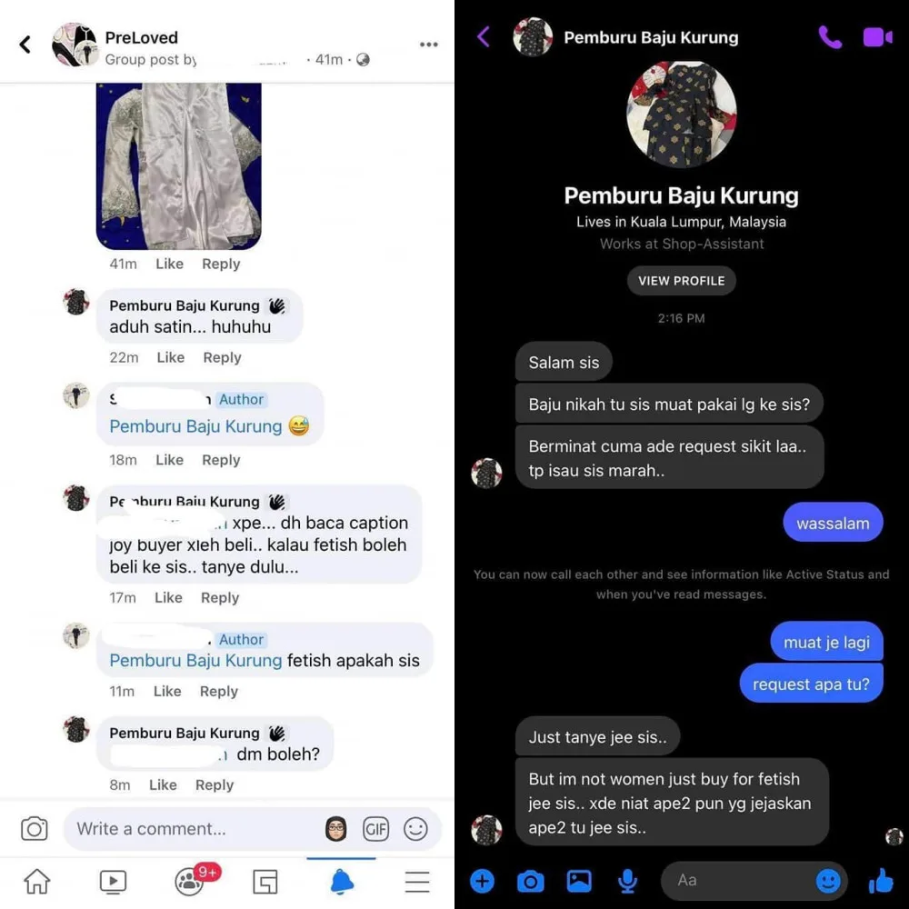 Akhi Fairuz uploaded a few screenshots showing a conversation between a woman who sells preloved clothes and a man who goes under the nickname Pemburu Baju Kurung. The latter had contacted the female seller to purchase the satin baju kurung sold by her.