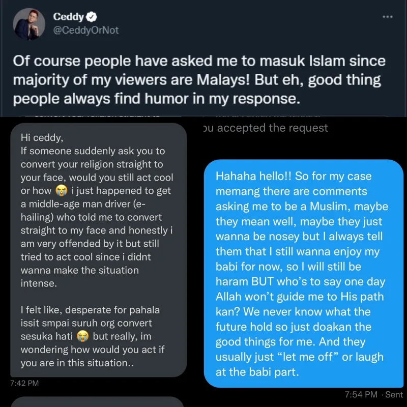 Yesterday (Tuesday, 18th October), a netizen DM-ed Ceddy on Twitter asking how he would usually deal with strangers asking him to convert to Islam. The anonymous user shared that they felt offended when an e-hailing driver suggested that they convert to another religion and things got awkward. “I’m wondering how would you act if you were in this situation?” asked the user.