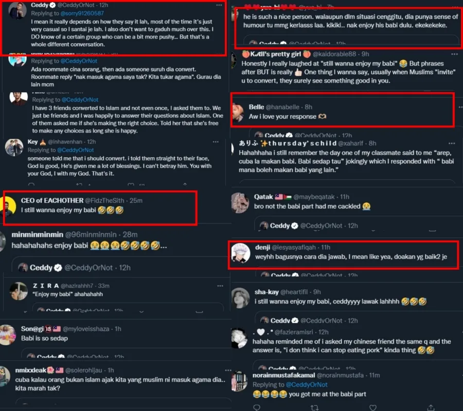 “We never know what the future holds so just pray good things for me. And [people] usually just “let me off” or laugh at the [pork] part,” he added. In a reply to a tweet by another user, Ceddy mentioned that he is not offended as the conversation of converting is usually casual but also said that he refuses to argue with anyone over the subject.