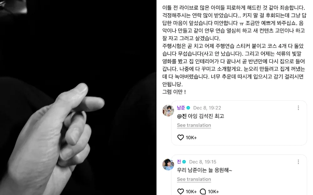 Fans have reacted to the post, voicing support for him amid the criticism. Some also expressed appreciation for the idol taking responsibility for his comments, noting that his candid remark could’ve brought misunderstandings. Fellow BTS member Jin (진) also commented on the post, writing, “I’ll always support our Namjoon.” However, the other members remain silent on the recent issues surrounding the group.