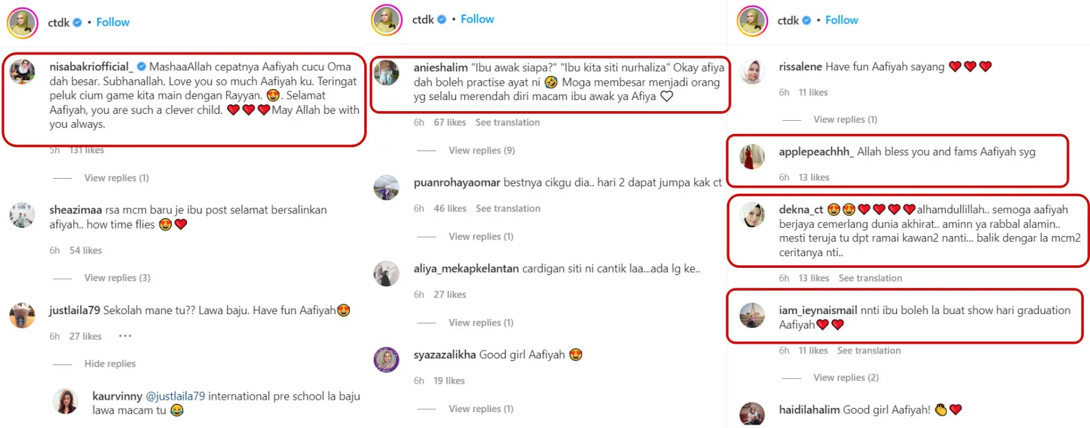 The posting has been flooded with avid fans of the “Anugerah Juara Lagu” winner leaving heartwarming wishes to the family. One commenter wrote, “Aafiyah can now start practising this line -‘Who is your mother? My mother is Siti Nurhaliza’. May Aafiyah grow up to be a humble person, just like her mother.” Another netizen remarked, “In the future, Ibu (TokTi) can sing at Aafiyah’s graduation ceremony. ❤❤”