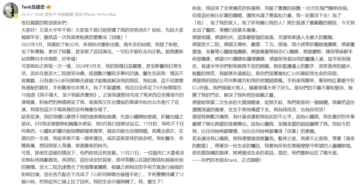 Earlier this week, the vocalist posted on his official Weibo page, detailing his experience of living with hereditary heart disease and undergoing a heart and liver transplant. According to the superstar, he was initially informed that the chances of fully curing were highly unlikely.