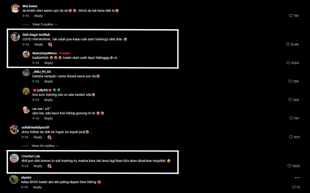 In a TikTok video, one user joked, “I was shocked to hear about Fattah and Amira getting married. Now I’m starting to get nervous. It’s just that a while back, I made a statement that if BASS got married, I’d climb Mount Kinabalu.” Didi cheekily replied, “There’s nothing wrong with starting a little training now,” which quickly fueled assumptions that Bella and Syed might indeed be preparing for marriage.