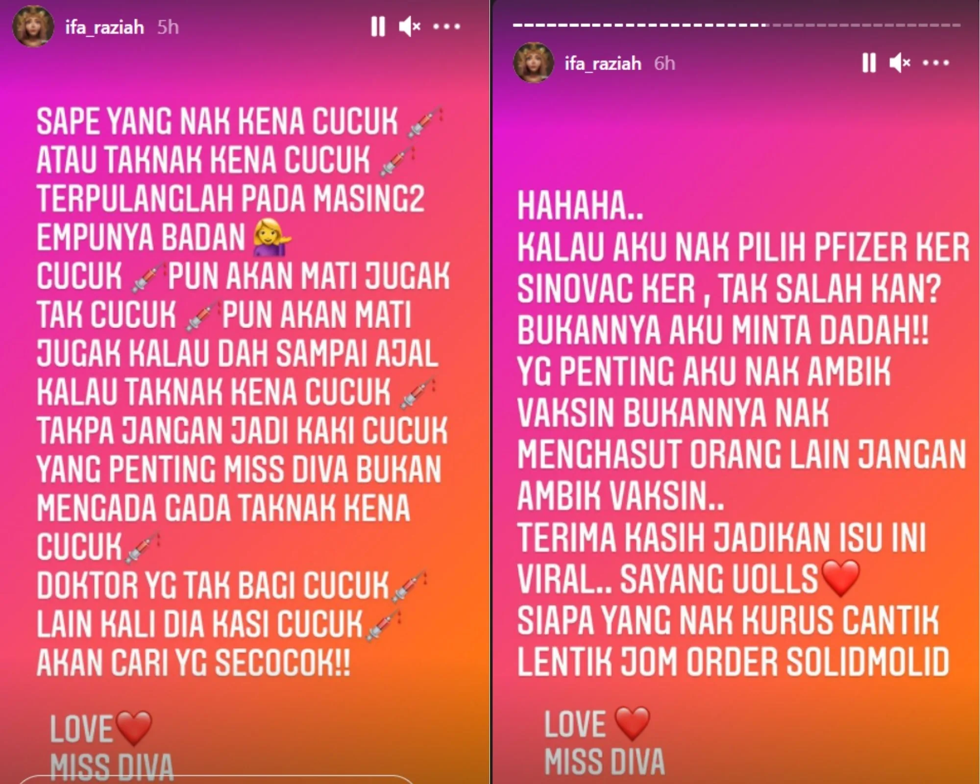 However, Ifa refuted those claims and said her cancellation was a result of confusion and a misunderstanding at her vaccination appointment centre in the Malaysia International Trade and Exhibition Centre (MITEC).