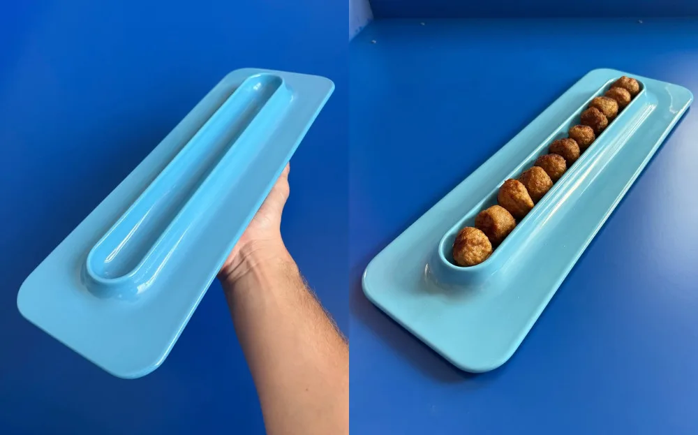 “I love designing objects for a specific function – it brings a touch of humour and makes them instantly easy to grasp. In Sweden, meatballs mean Christmas, and this plate is my way of honouring that tradition. The design is simple, lining up the meatballs so each one is visible, like they’re sitting on little thrones. And while it was created with meatballs in mind, it works just as well for many other dishes,” says Gustaf about the product.