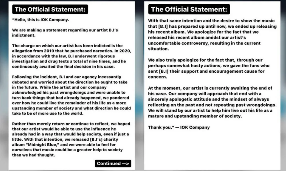 B.I’s home label has released an official statement after reports about his indictment came to light. In the statement, the company apologised for releasing B.I’s album while he was still awaiting a decision in his case.