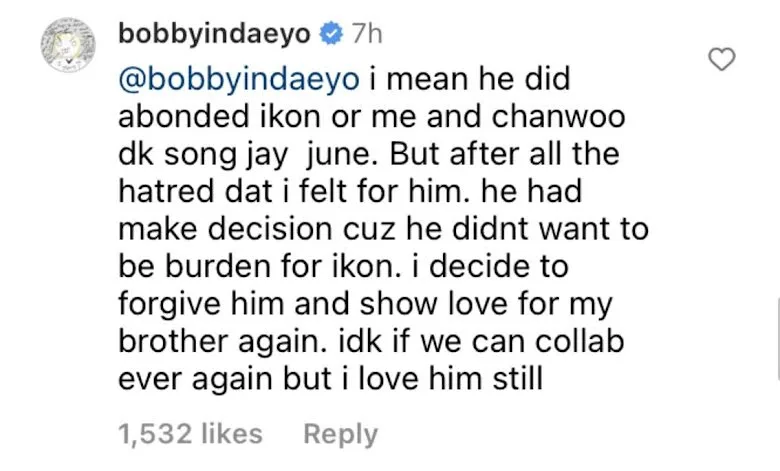 The singer also admitted that he forgives his former leader for what had happened and urged iKON fans to give the artist a chance to redeem himself saying, “Forgiveness is the most noble thing that human beings can do.” He also added in the comments section to ask everyone to stop arguing with each other on the matter of who was right or wrong.