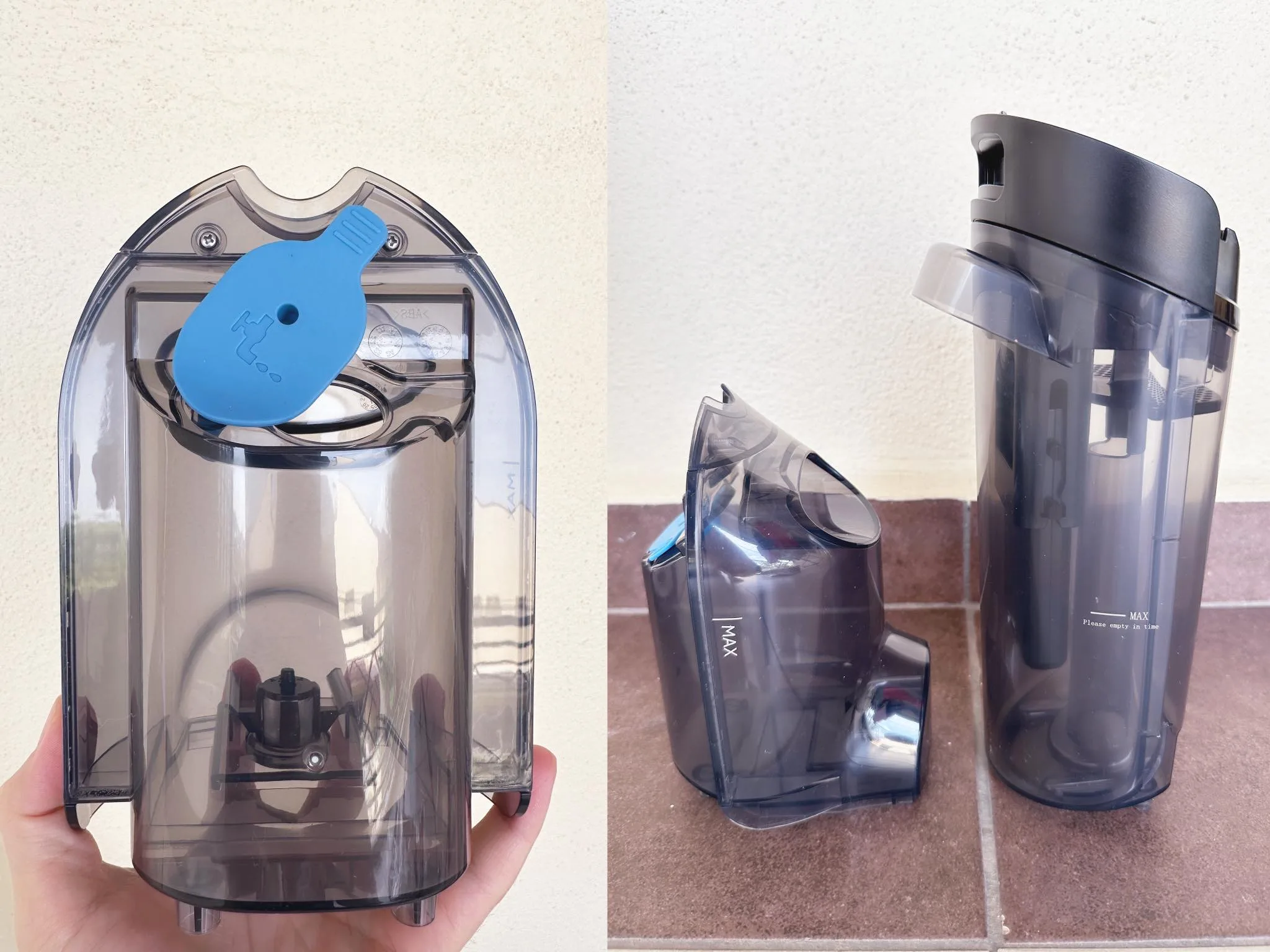 Where does the water go you asked? The W90 has a dual tank capacity – a 700ml clean water tank at the back and 500ml dirty tank at the front, just above the roller floor brush. Pressing the water spray button sends a jet of clean water into the cleaning head.
