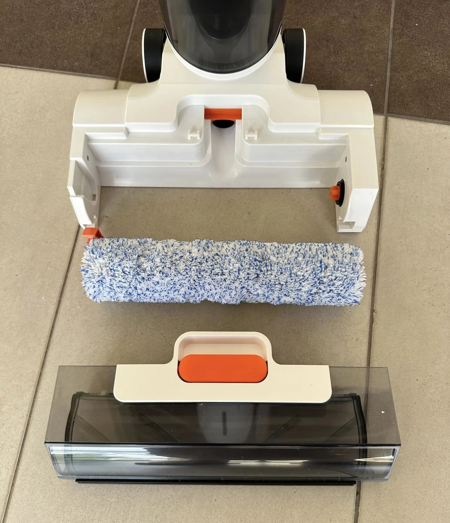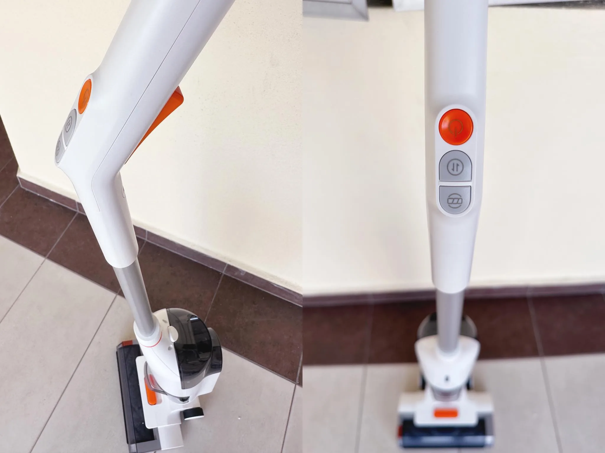 Speaking of which, the handle has 3 buttons – the on and off button, the power suction, and the one-click robust self-cleaning (that runs for a minute long). And the back of the handle is orange water spray button that causes a fine mist to spray on the floor.