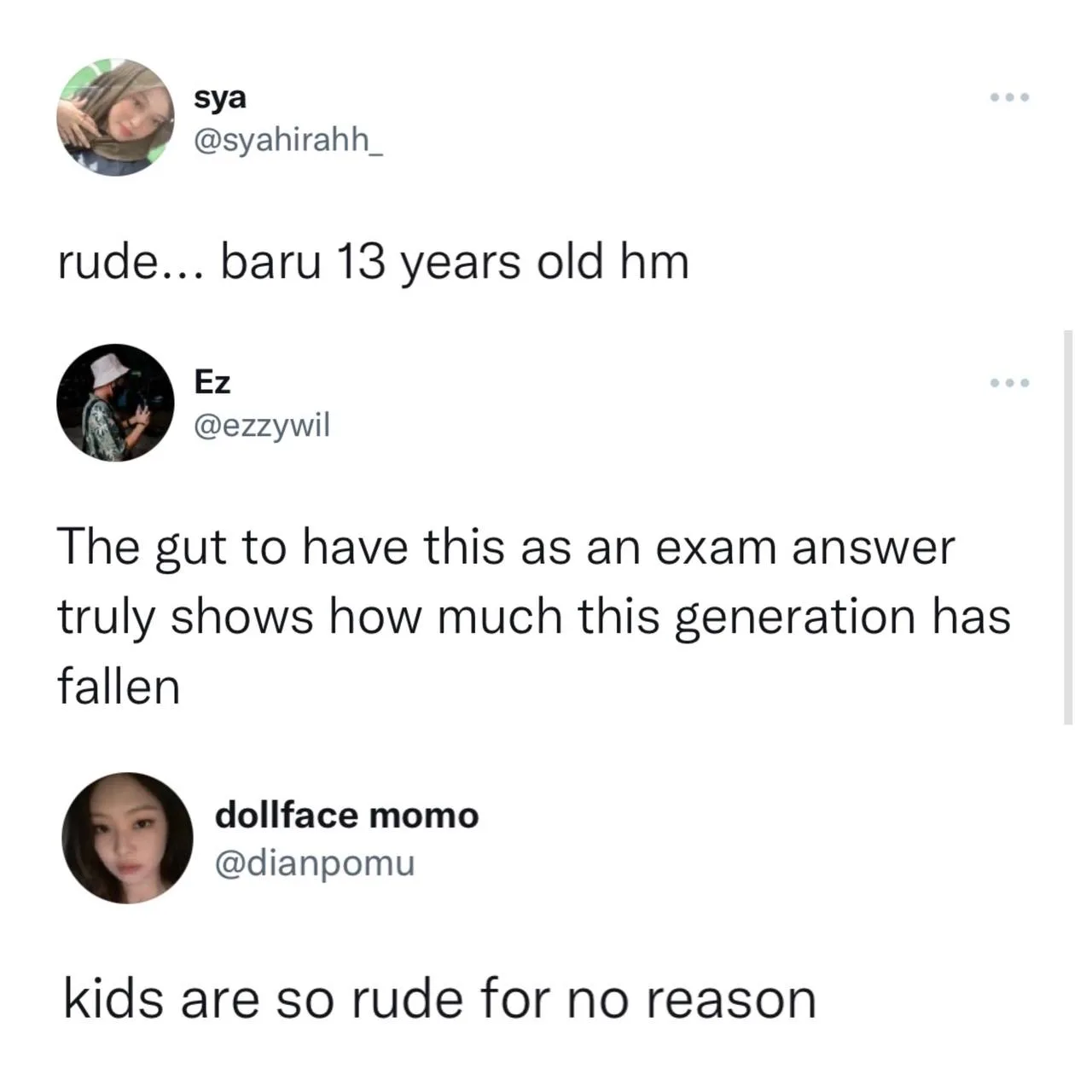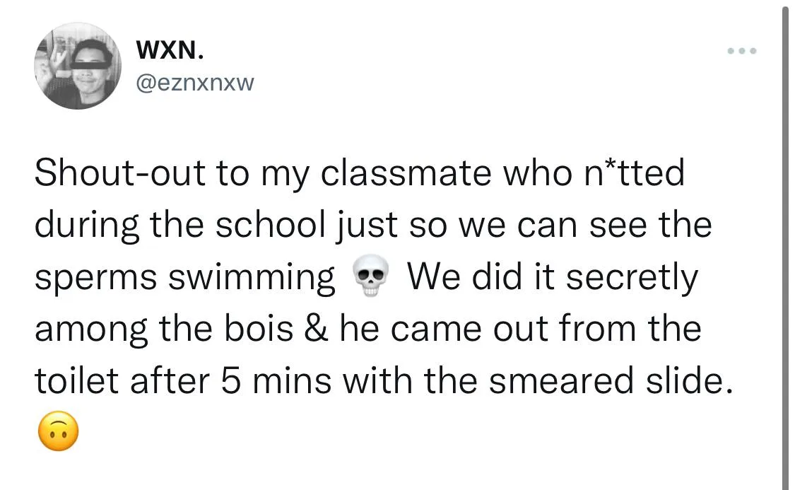 Among the comments that condemned the younger generation for being rude, one tweet has got us ROFL-ing. User (@eznxnxw) tweeted, “Shout-out to my classmate who n*tted during school just so we (could) see the sperms swimming. We did it secretly among the bois & he came out from the toilet after 5 mins with the smeared slide. ”