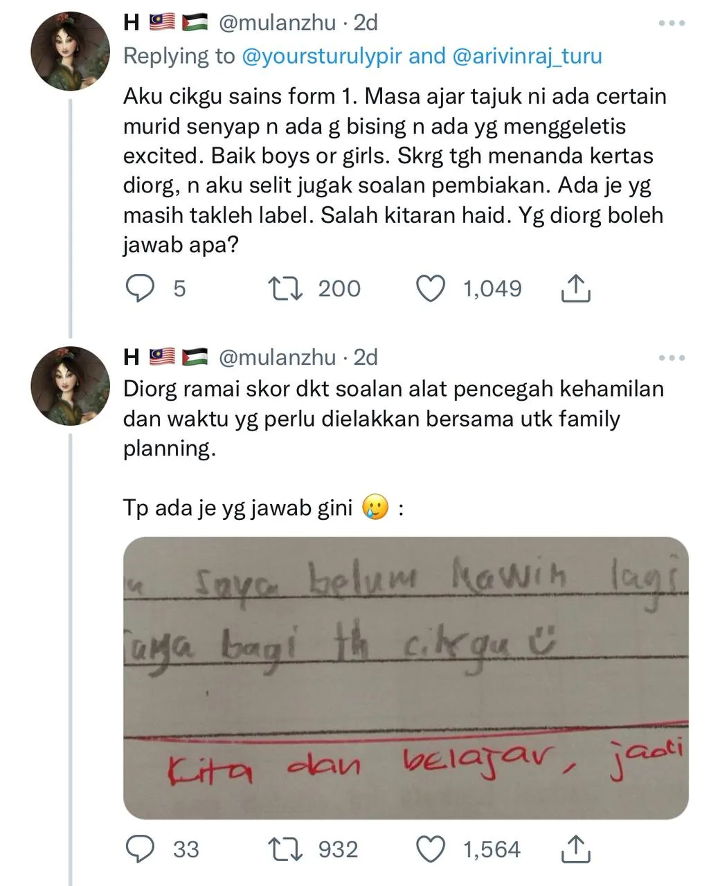 The tweet garnered netizens’ attention, but one reply from a teacher who taught Form 1 students left the majority dumbfounded. The user (@mulanzhu), stated that when she was teaching the topic, half of her students stayed silent while another handful got excited. That was fairly normal. What wasn’t normal however, were the answers she received during a test.