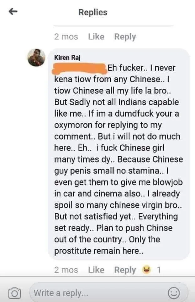 The final-year medical student also insulted the size of Chinese men’s private parts and mentioned about a “plan” to push Chinese out of the country.